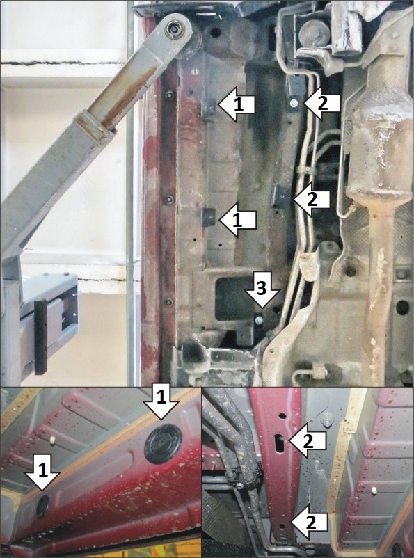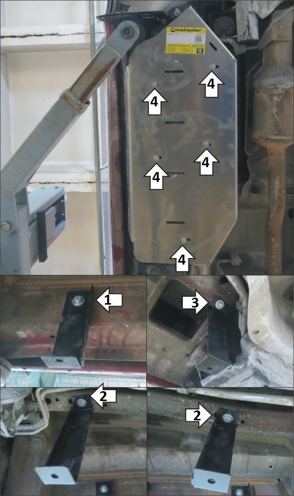 Защита устанавливается поверх штатного пыльника. 1. Снять пыльник. Установить кронштейны .02 в отверстия в кузове автомобиля (предварительно вытащив из них закглушки) при помощи планок ПУ 60х14х6, болтов М8х30, шайб и гр. шайб 8. 2. Установить кронштейны .03 и .04 в овальные отверстия в лонжероне автомобиля при помощи планок ПР 50х20х6, болтов М8х30, шайб и гр. шайб 8. 3. Установить кронштейн .05 в отверстие в поперечине кузова при помощи закладной КР 50хМ8, гайки М8х30, шайбы и гр. шайбы 8. Установить на место пластиковый пыльник, по месту сделав нём отверстия под кронштейны. 4. Прикрепить щит к кронштейнам при помощи болтов М8х30, шайб и гр. шайб 8. Затянуть весь крепеж.