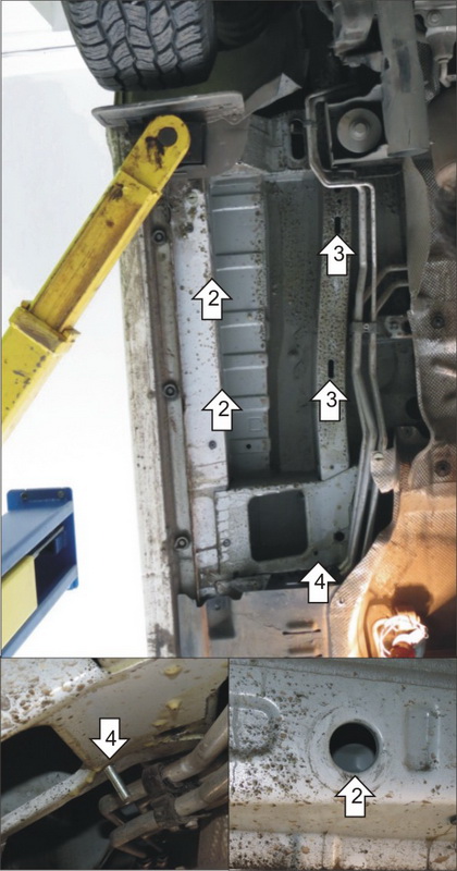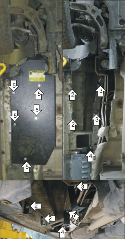 1. При наличии снять штатный пластиковый пыльник. 2. Установить два кронштейны в кузов а/м при помощи ПУ 60х14х6, Болтов М8х30, Гр8 и Ш8 в отверстия кузова. 3. Установить два кронштейн в лонжерон при помощи ПР 50х20х6, Болтов М8х30, Гр8 и Ш8. 4. Установить кронштейн на фланец кузова при помощи КР 50 А10, Гайки М8, Гр8 и Ш8. 5. Установить на кронштейны щит при помощи Болтов М8, Гр8 и Ш8.