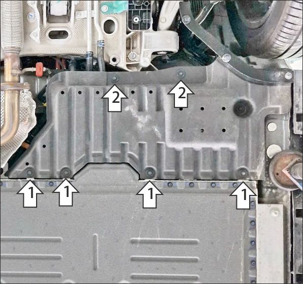 1. В штатные резьбовые отверстия крепления пыльника к поперечине аккумулятора установить задние точки крепления защиты при помощи болтов М6х30 с шайбами и гр. шайбами 6. 2. Прикрепить передние точки крепления защиты к кронштейнам пыльника при помощи проставок 35, болтов М6х60 с шайбами и гр. шайбами 6. Затянуть весь крепеж с требуемым усилием.