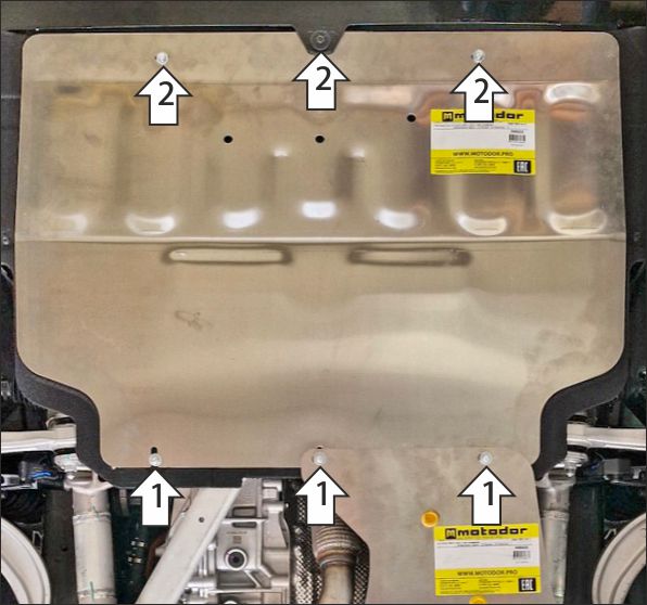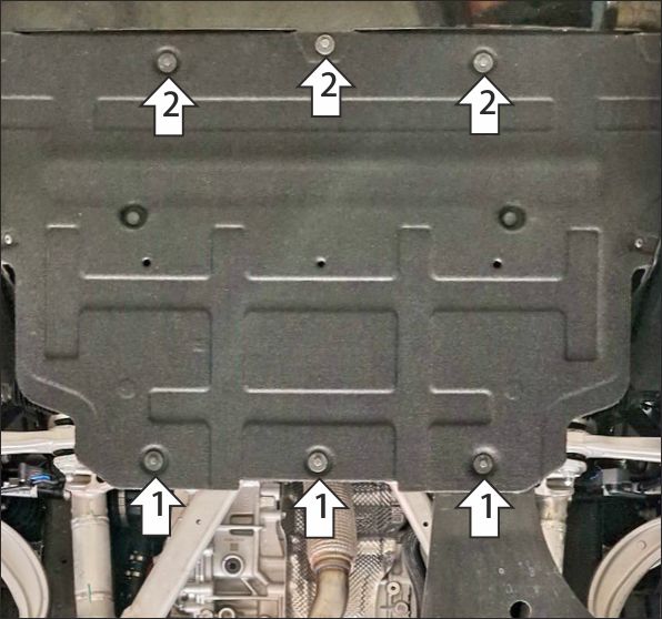 1. В штатные резьбовые отверстия крепления пыльника к подрамнику автомобиля установить задние точки крепления защиты при помощи болтов М6х30 с шайбами и гр. шайбами 6. 2. В штатные резьбовые отверстия крепления пыльника к рамке радиатора установить передние точки крепления защиты при помощи болтов М6х30 с шайбами и гр. шайбами 6. Затянуть весь крепеж с требуемым усилием.