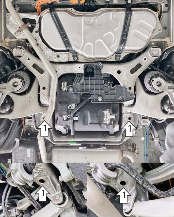 Устанавливается только с защитой топливного бака MOTODOR и поверх штатного пыльника, для автомобилей в комплектации EVR Sport Edition. Снять штатный пластиковый пыльник для удобства установки балки. 1. В штатные отверстия в подрамнике задней подвески установить балку при помощи закладных планок ПР80х20х6 М10 и болтов М10х30 с шайбами и гр. шайбами 10. Вернуть на место пыльник, сделав в неём отверстие под балку. 2. Совместно с задними точками крепления защиты топливного бака MOTODOR установить передние точки крепления щита. 3. Прикрепить щит к балке при помощи болтов М8х30 с шайбами и гр. шайбами 8. Затянуть весь крепеж с требуемым усилием.