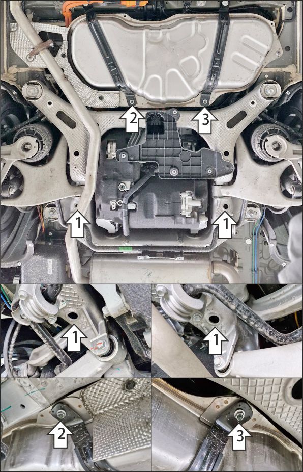 Устанавливается поверх штатного пыльника, для автомобилей в комплектации EVR Sport Edition. Снять штатный пластиковый пыльник для удобства установки балки и кронштейнов. 1. В штатные отверстия в подрамнике задней подвески установить балку при помощи закладных планок ПР80х20х6 М10 и болтов М10х30 с шайбами и гр. шайбами 10. 2. Под штатную гайку крепления хомута топливного бака установить правый кронштейн. 3. Под штатную гайку крепления хомута топливного бака установить левый кронштейн. Вернуть на место пыльник, сделав в неём отверстия под балку и под болт крепления щита к правому кронштейну. 4. Прикрепить щит к балке и кронштейнам при помощи болтов М8х30 с шайбами и гр. шайбами 8. Затянуть весь крепеж с требуемым усилием.